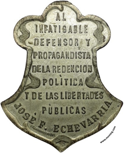 Anverso: AL / INFATIGABLE / DEFENSOR Y / PROPAGANDISTA / DE LA REDENCION / POLÍTICA / Y DE LAS LIBERTADES / PÚBLICAS / JOSÉ F. ECHEVARRIA. Firma: BELLAGAMBA Y ROSSI Reverso: ASESINADO / POR AGENTES / DE POLICIA / EL 5 DE ENERO / 1902 / HOMENAJE / DE LA JUVENTUD / 5 DE ENERO / 1904 Referencia: | |