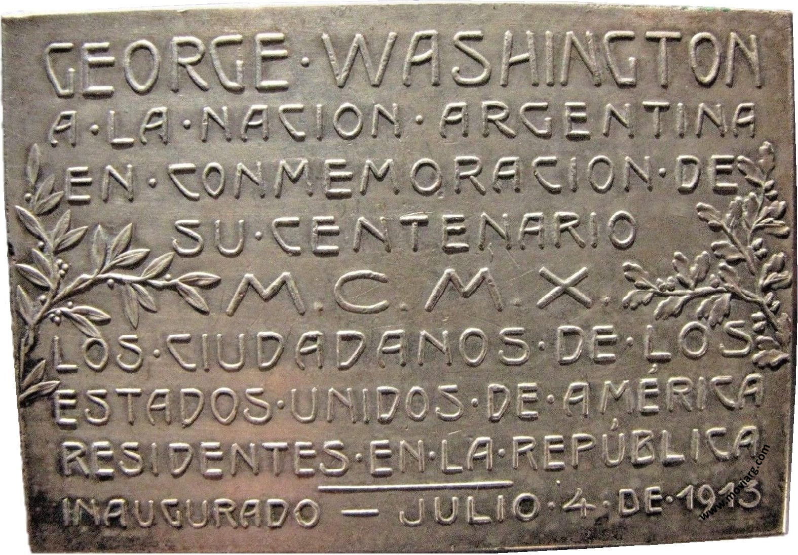 Anverso: Reverso: GEORGE WASHINGTON / A LA NACION ARGENTINA / EN CONMEMORACION DE / SU CENTENARIO / MCMX / LOS CIUDADANOS DE LOS / ESTADOS UNIDOS DE AMÉRICA / RESIDENTES EN LA REPÚBLICA / INAUGURADO - JULIO 4 DE 1913 Referencia: | |
