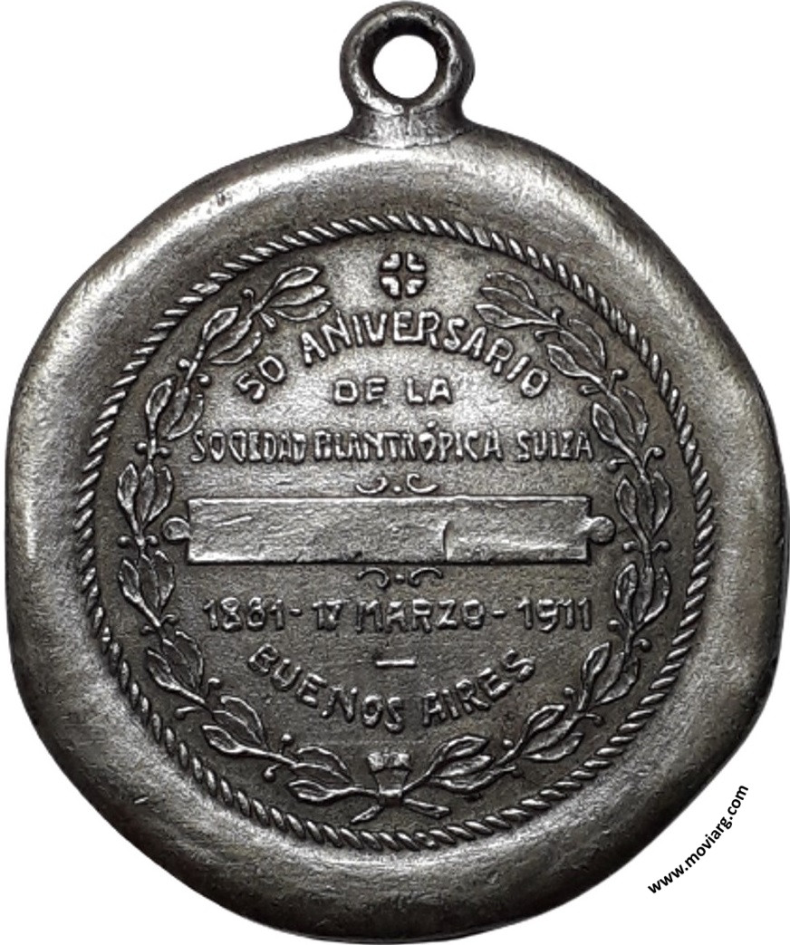 Colección MDS Anverso: UNO PARA TODOS / TODOS PARA UNO. Firma: HORTA Y CIAReverso: 50 ANIVERSARIO / DE LA / SOCIEDAD FILANTRÓPICA SUIZA / 1861 - 17 MARZO - 1911 / BUENOS AIRES Referencia: | |