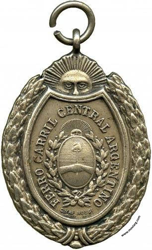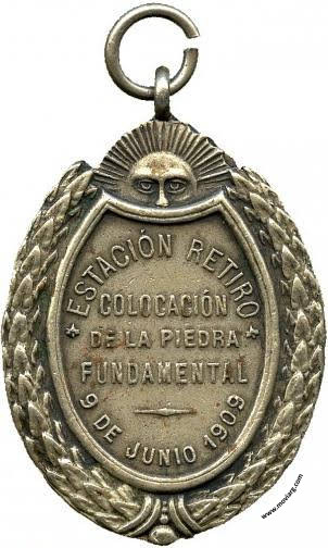 Anverso: FERRO CARRIL CENTRAL ARGENTINO. Firma: C. Y AF. ROSSI Reverso: ESTACIÓN RETIRO / COLOCACIÓN / DE LA PIEDRA / FUNDAMENTAL / 9 DE JUNIO 1909 Referencia: | |