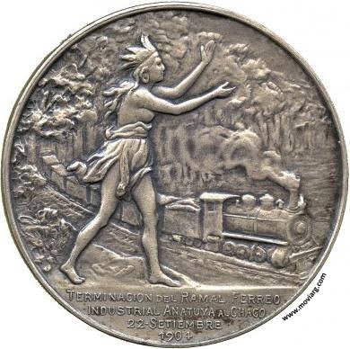 Anverso: TERMINACION DEL RAMAL FERREO / INDUSTRIAL ANATUYA AL CHACO / 22 - SETIEMBRE / 1904 Reverso: EMPRESA CONSTRUCTORA / COLSON, BROOKHOUSE Y PYNE - LA CIA. BELGA ARGENTINA DE FERRO CARRILES / PRESIDENTE / DE LA REPÚBLICA / TENIENTE GENERAL / JULIO A. ROCA / MINISTRO DE OBRAS PÚBLICAS / EMILIO CIVIT. Firma: J. GOTTUZZO Referencia: | |