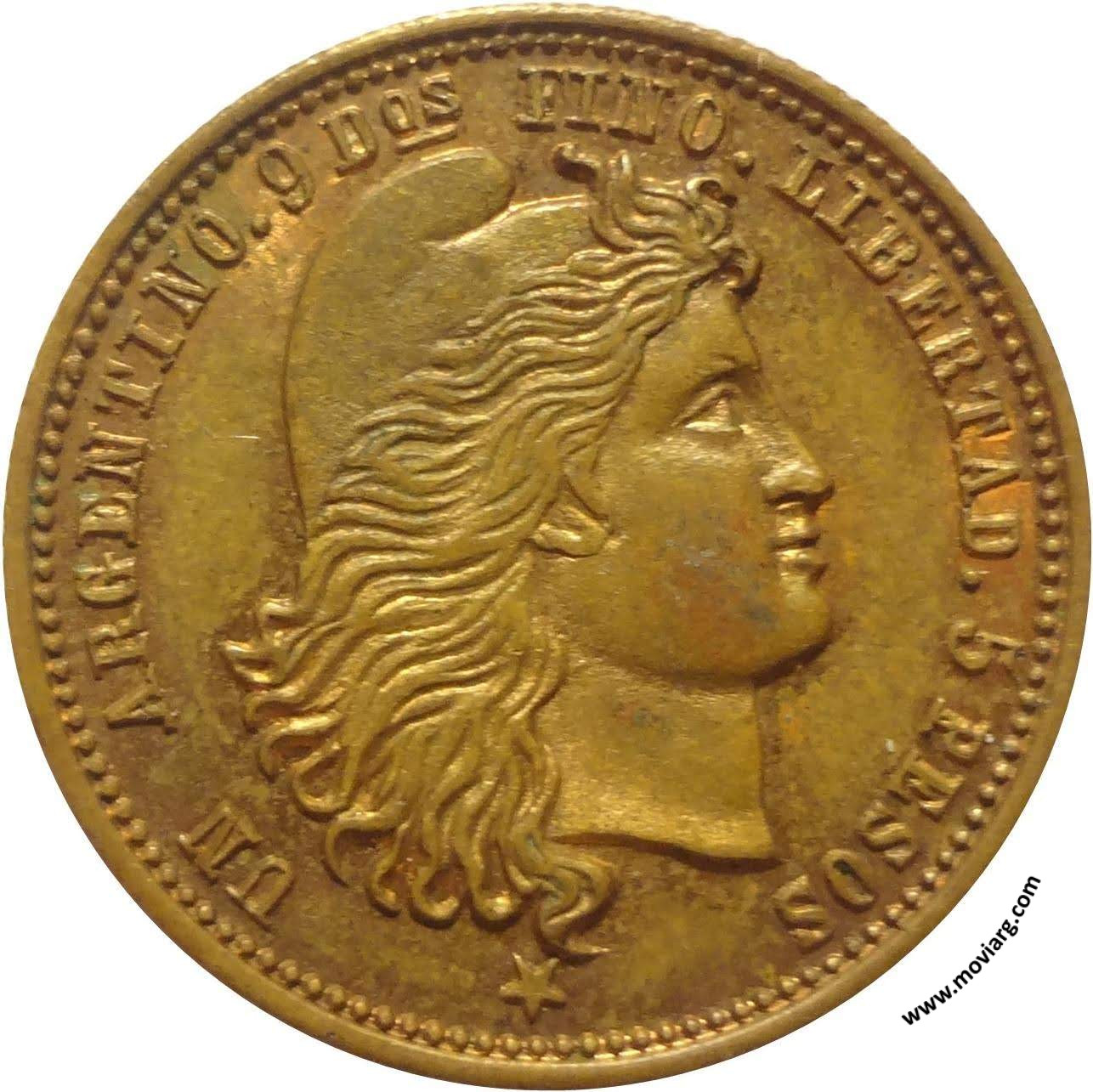 Anverso: UN ARGENTINO. 9 DOS. FINO. LIBERTAD. 5 PESOS Reverso: Referencia: | |