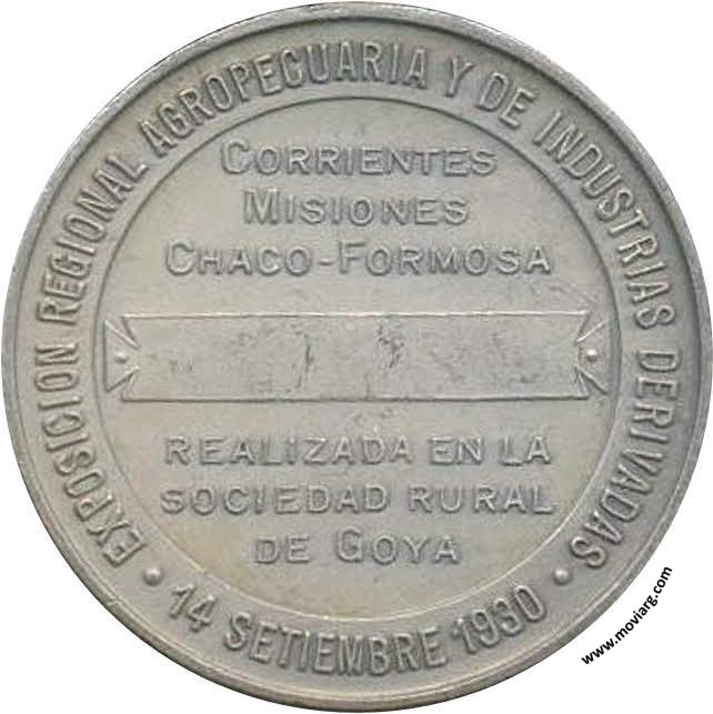 Anverso: MINISTERIO DE AGRICULTURA / REPÚBLICA ARGENTINA. Firma: CONSTANTE ROSSI Reverso: EXPOSICION REGIONAL AGROPECUARIA Y DE INDUSTRIAS DERIVADAS / 14 SETIEMBRE 1930 / CORRIENTES / MISIONES / CHACO-FORMOSA / REALIZADA EN LA / SOCIEDAD RURAL / DE GOYA Referencia: | |
