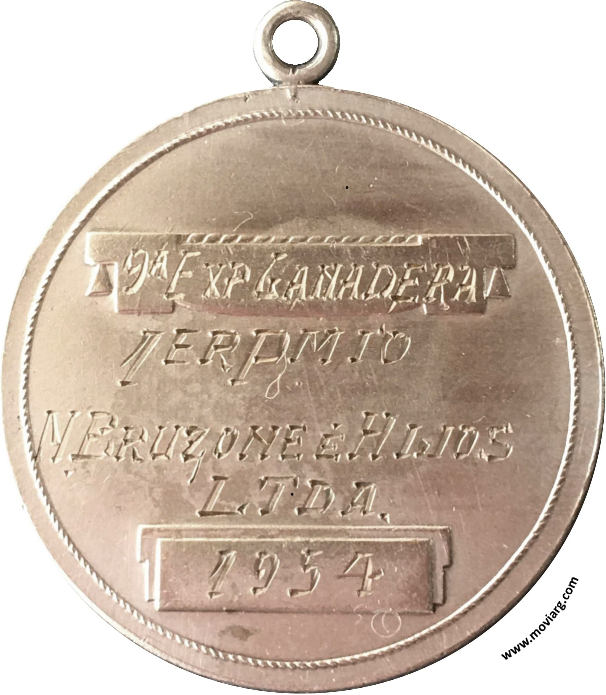 Anverso: SOCIEDAD RURAL DE JUNIN / " EL MEJOR PUEBLO ES EL QUE / MAS CULTIVA LA TIERRA ". Firma: O. GALLO / ARGENTINA Reverso: [ 9A. EXP. GANADERA ] / [ 1ER. PREMIO ] / [ N. BRUZONE E HIJOS ] / [ LTDA. ] / [ 1954 ] Referencia: | |