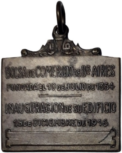 Colección MDS Anverso: 1854 - 1916Reverso: BOLSA DE COMERCIO DE BS. AIRES / FUNDADA EL 10 DE JULIO DE 1854 / INAUGURACION DE SU EDIFICIO / 15 DE DICIEMBRE DE 1916 Referencia: | |
