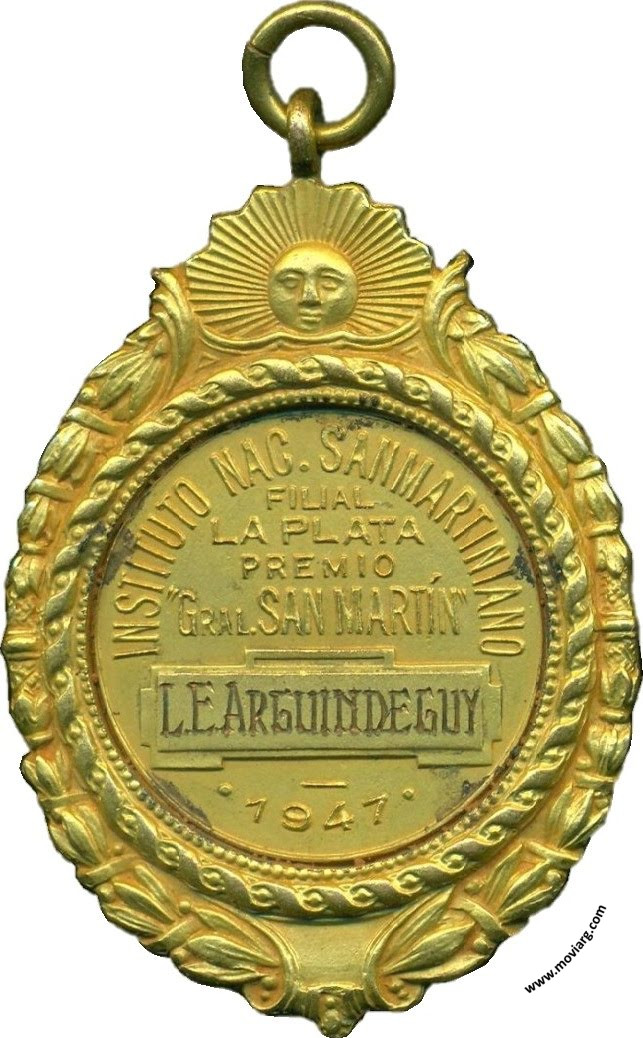 Anverso: SAN MARTIN. Firma: C. Y AF. ROSSI Reverso: INSTITUTO NAC. SANMARTINIANO / FILIAL / LA PLATA / PREMIO / " GRAL. SAN MARTÍN " / [ L. E. ARGUINDEGUY ] / 1947 Referencia: | |