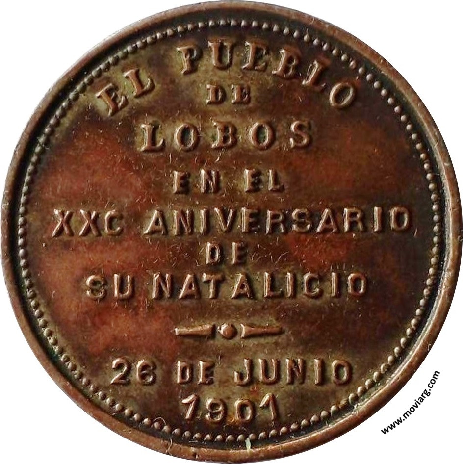 Anverso: MITRE Reverso: EL PUEBLO / DE / LOBOS / EN EL / XXC (sic) ANIVERSARIO / DE / SU NATALICIO / 26 DE JUNIO / 1901 Referencia: ROSA-28 (M80) | |
