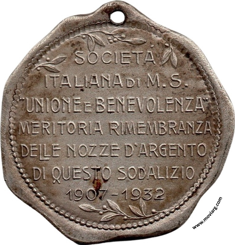 Anverso: Reverso: SOCIETÁ / ITALIANA DI M.S. / " UNIONE E BENEVOLENZA " / MERITORIA RIMEMBRANZA / DELLE NOZZE D'ARGENTO / DI QUESTO SODALIZIO / 1907 - 1932 Referencia: | |