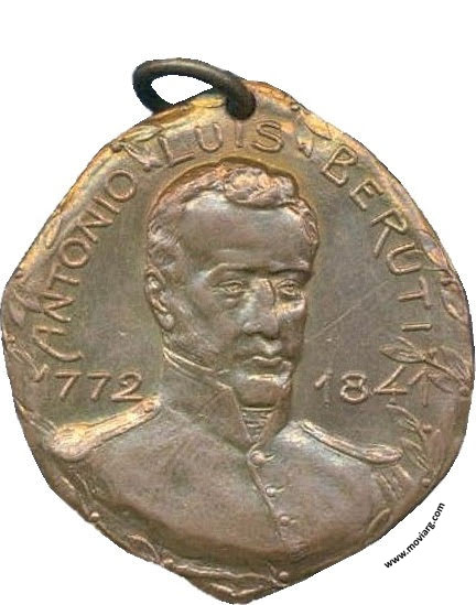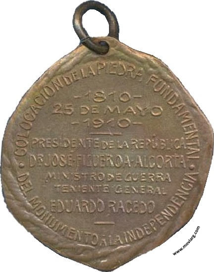 Anverso: ANTONIO LUIS BERUTI / 1772 / 1841 Reverso: COLOCACION DE LA PIEDRA FUNDAMENTAL / DEL MONUMENTO Á LA INDEPENDENCIA / - 1810 - / 25 DE MAYO / - 1910 - / PRESIDENTE DE LA REPÚBLICA / DR. JOSÉ FIGUEROA ALCORTA / MINISTRO DE GUERRA / TENIENTE GENERAL / EDUARDO RACEDO Referencia: | |