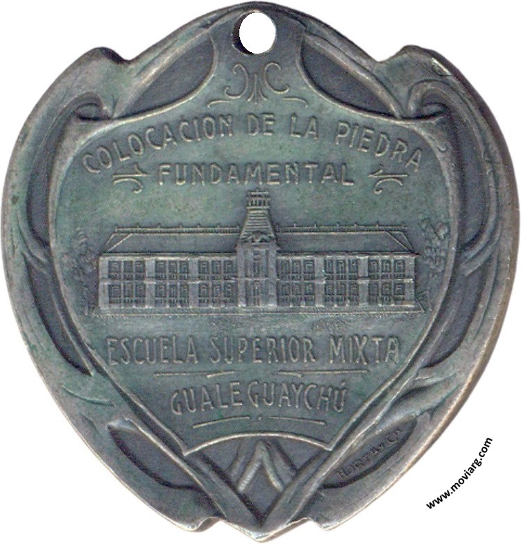 Anverso: COLOCACION DE LA PIEDRA / FUNDAMENTAL / ESCUELA SUPERIOR MIXTA / GUALEGUAYCHÚ. Firma: HORTA Y CIA. Reverso: ENTRE RIOS / GOB: DE FAUSTINO M. PARERA / ENERO 6 DE 1908 Canto: Liso. PLATA Referencia: | |