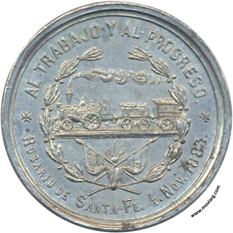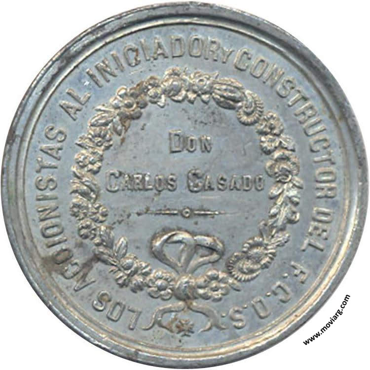 Anverso: AL TRABAJO Y AL PROGRESO / ROSARIO DE SANTA-FE. 4. NOV. 1883. Firma: S. CACCIA Reverso: LOS ACCIONISTAS AL INICIADOR Y CONSTRUCTOR DEL F.C.O.S. / DON / CARLOS CASADO Referencia: FERRARI-52 (SC) | |