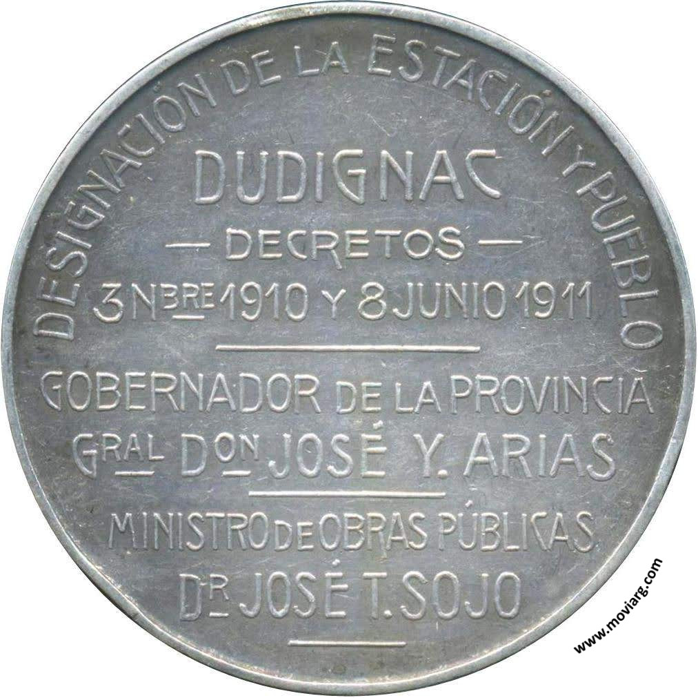 Anverso: FERRO CARRIL MIDLAND / DE BUENOS AIRES. Campo: ENRIQUE LAVALLE. Firma: F. COSTA Reverso: DESIGNACIÓN DE LA ESTACIÓN Y PUEBLO / DUDIGNAC / - DECRETOS - / 3 NBRE. 1910 Y 8 JUNIO 1911 / GOBIERNO DE LA PROVINCIA / GRAL. DON JOSÉ Y. ARIAS / MINISTRO DE OBRAS PÚBLICAS / DR. JOSÉ T. SOJO Referencia: | |
