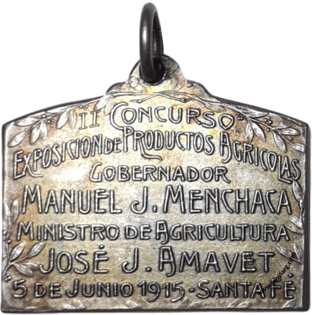 Colección MDS Anverso:Reverso: II CONCURSO / EXPOSICION DE PRODUCTOS AGRICOLAS / GOBERNADOR / MANUEL J. MENCHACA / MINISTRO DE AGRICULTURA / JOSÉ J. AMAVET / 5 DE JUNIO 1915 · SANTA FÉ Canto: Liso. PLATA Referencia: | |