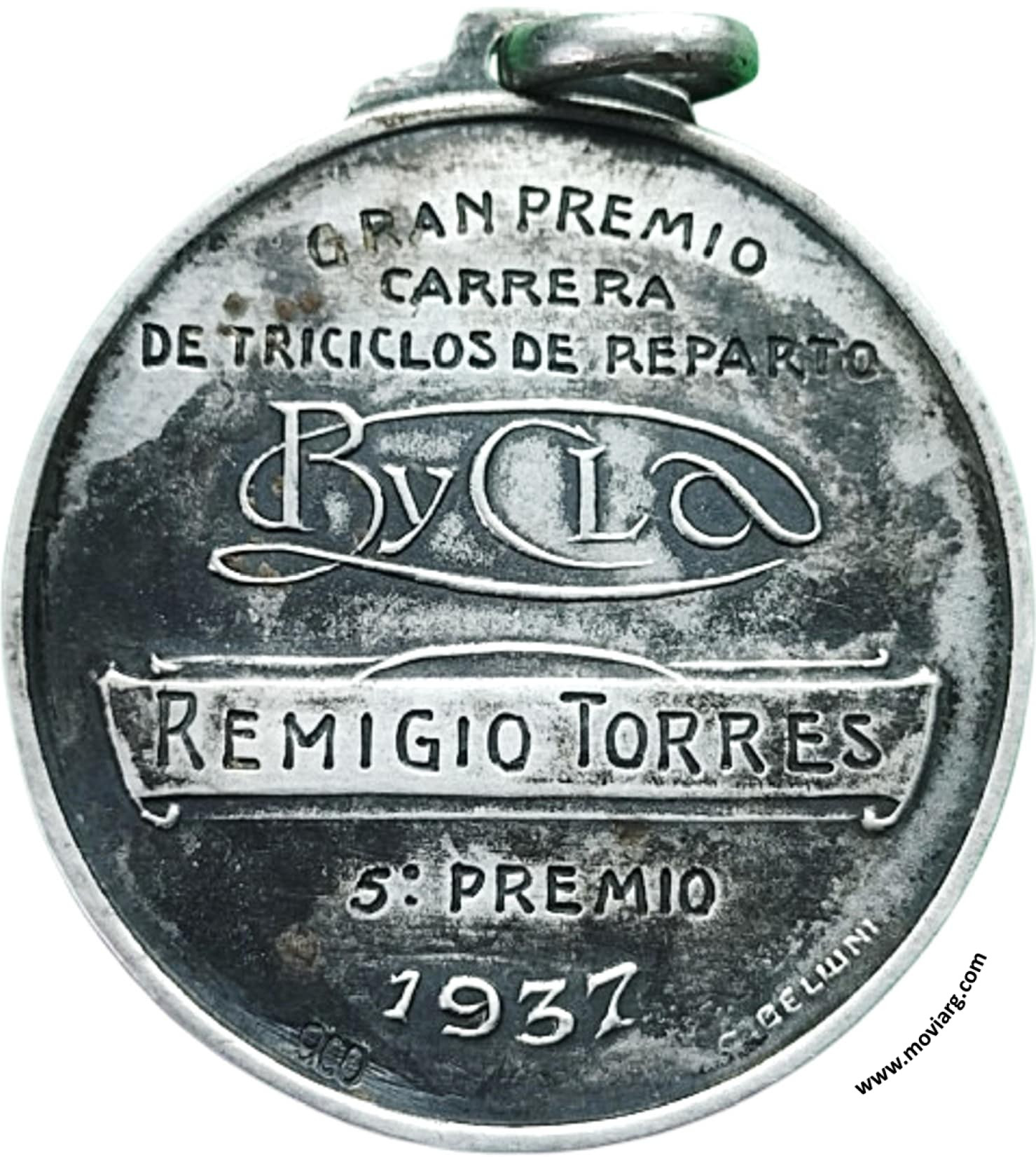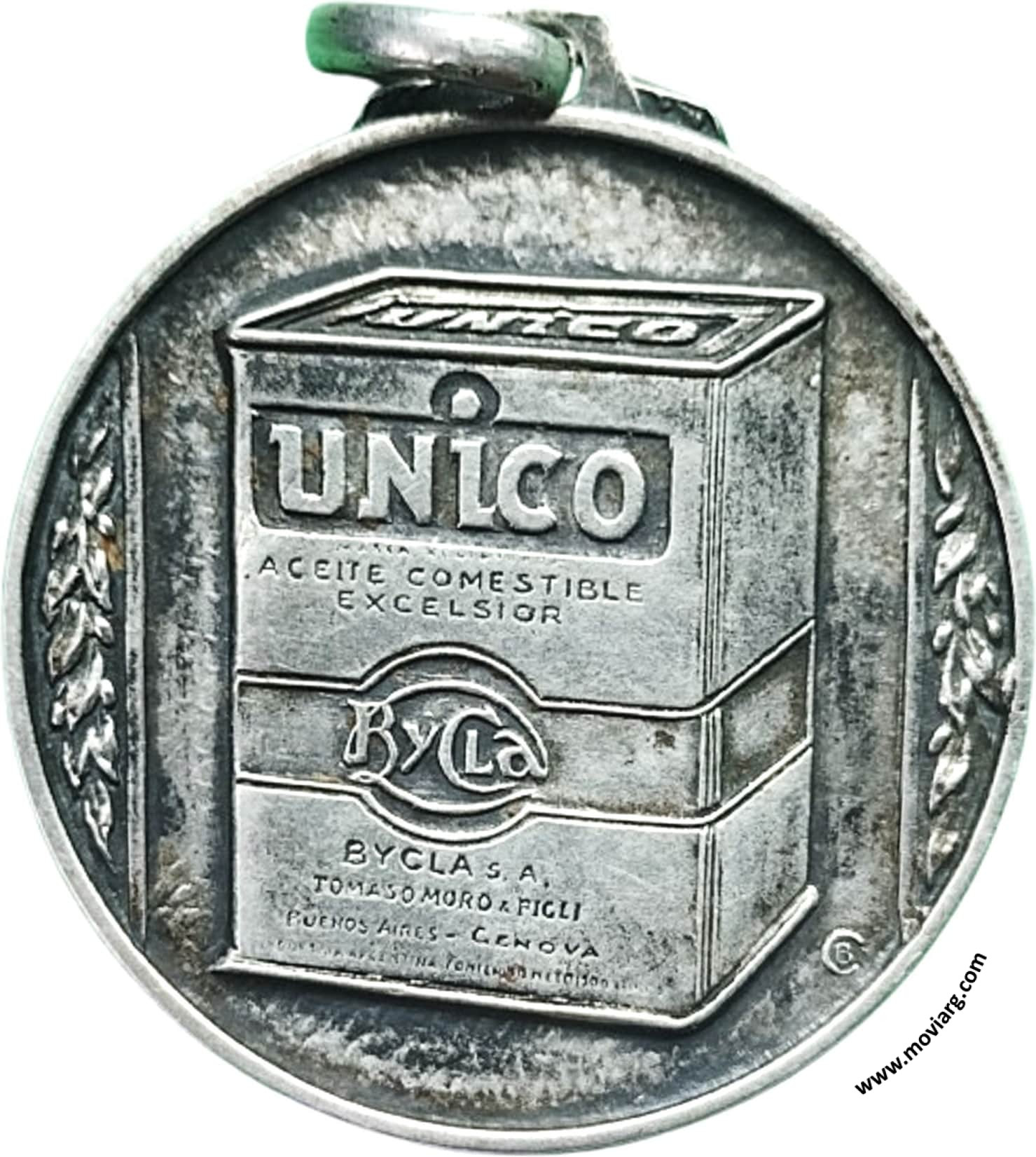 Anverso: Campo: UNICO / BYCLA / BYCLA S.A. / TOMASO MORO & FIGLI / BUENOS AIRES - GENOVA - INDUSTRIA ARGENTINA CONTENIDO NETO 1500ML. Firma: C.B. Reverso: [ GRAN PREMIO ] / [ CARRERA ] / [ DE TRICICLOS DE REPARTO ] / BYCLA / [ REMIGIO TORRES ] / [ 5° PREMIO ] / 1937. Firma: C. BELLUNI. Exergo: [ 900 ] Referencia: | |