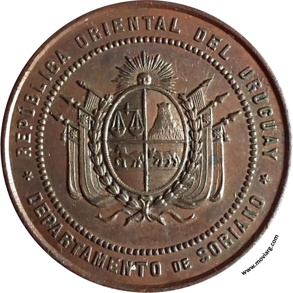 Anverso: REPÚBLICA ORIENTAL DEL URUGUAY / DEPARTAMENTO DE SORIANO Reverso: 1RA. EXPOSICION FERIA DE GANADERIA AGRICULTURA É INDUSTRIAS / 19 DE ABRIL / DE 1892 / MERCEDES. Firma: GRANDE Referencia: FERRARI-196 (RG) | |