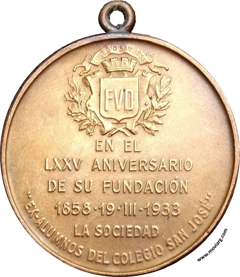 Anverso: AL COLEGIO SAN JOSÉ / BUENOS AIRES. Firma: CONSTANTE ROSSI Reverso: EN EL / LXXV ANIVERSARIO / DE SU FUNDACIÓN / 1858 · 19 · III · 1933 / LA SOCIEDAD / " EX - ALUMNOS DEL COLEGIO SAN JOSÉ ". Campo: FVD / COLEGIO SAN JOSE Referencia: | |