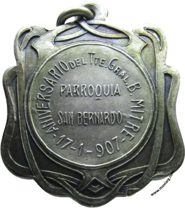 Anverso: Firma: HORTA Y CIA. Reverso: ANIVERSARIO DEL TTE. GRAL. B. MITRE / PARROQUIA / SAN BERNARDO / 17 - 1 - 907 Referencia: | |