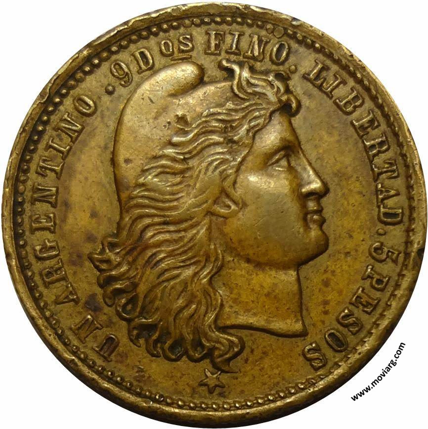 Anverso: UN ARGENTINO. 9 DOS. FINO. LIBERTAD. 5 PESOS Reverso: UNITED STATES OF AMERICA / 5D Referencia: | |