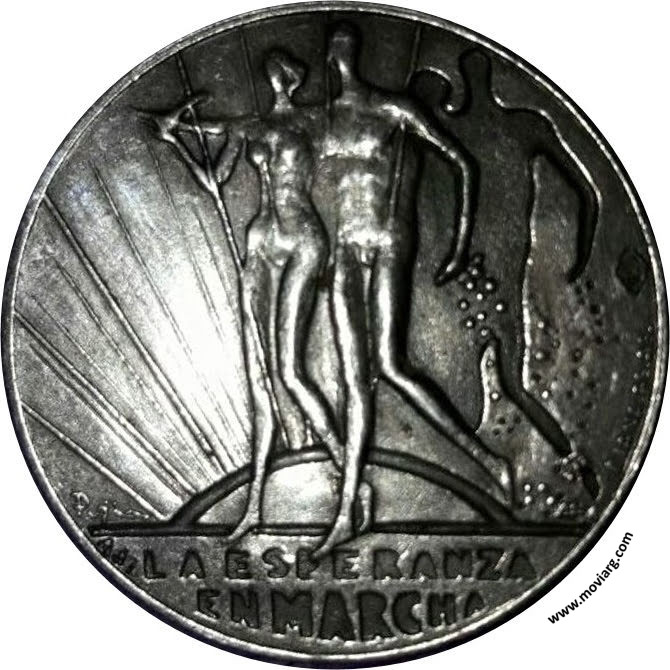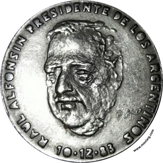 Anverso: RAUL ALFONSIN PRESIDENTE DE LOS ARGENTINOS / 10 · 12 · 83. Firma: PUJIA Reverso: LA ESPERANZA / EN MARCHA. Firma: PIANA BS. AS. Referencia: | |