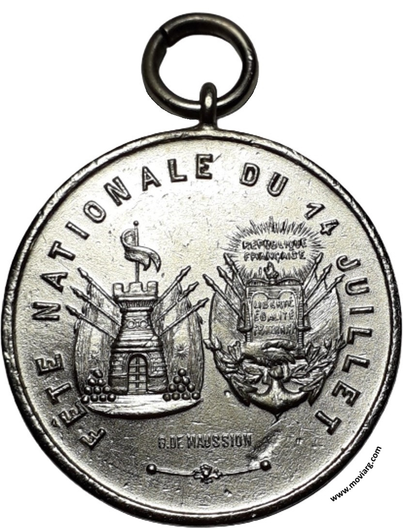 | Año: (1900) Colectividades Metal: Plateado - Peso: 11.55gr - Módulo: 30.53mm - Espesor: 2.42mm - Rotación: 12hrs Grabador: G. de Maussion | |