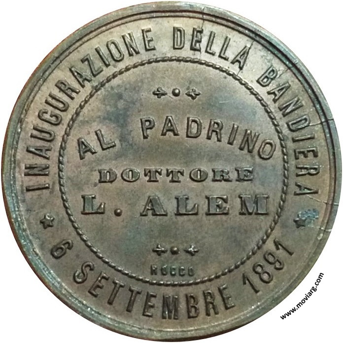 Anverso: SOCIETÀ DI M.S. / FIGLI DEL VESUVIO Reverso: INAUGURAZIONE DELLA BANDIERA / 6 SETTEMBRE 1891 / AL PADRINO / DOTTORE / L. ALEM. Firma: ROCCO Referencia: | |