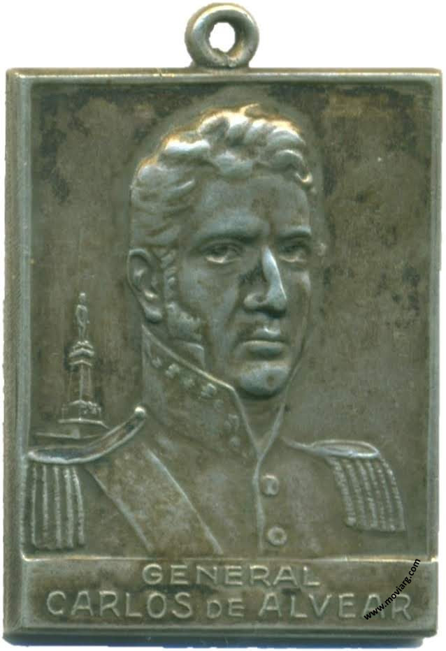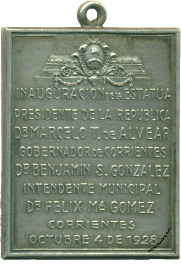 Anverso: GENERAL / CARLOS DE ALVEAR Reverso: INAUGURACIÓN DE LA ESTATUA / PRESIDENTE DE LA REPUBLICA / DR. MARCELO T. DE ALVEAR / GOBERNADOR DE CORRIENTES / DR. BENJAMIN S. GONZALEZ / INTENDENTE MUNICIPAL / DR. FELIX MA. GOMEZ / CORRIENTES / OCTUBRE 4 DE 1928 Referencia: | |
