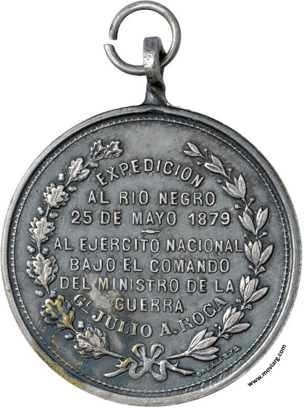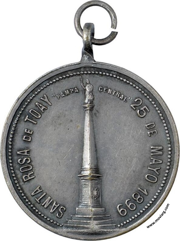 Anverso: SANTA ROSA DE TOAY "PAMPA CENTRAL" 25 DE MAYO 1899 Reverso: EXPEDICION / AL RIO NEGRO / 25 DE MAYO 1879 / AL EJERCITO NACIONAL / BAJO EL COMANDO / DEL MINISTRO DE LA / GUERRA / GL. JULIO A. ROCA. Firma: ORZALI B. Y C. Referencia: | |