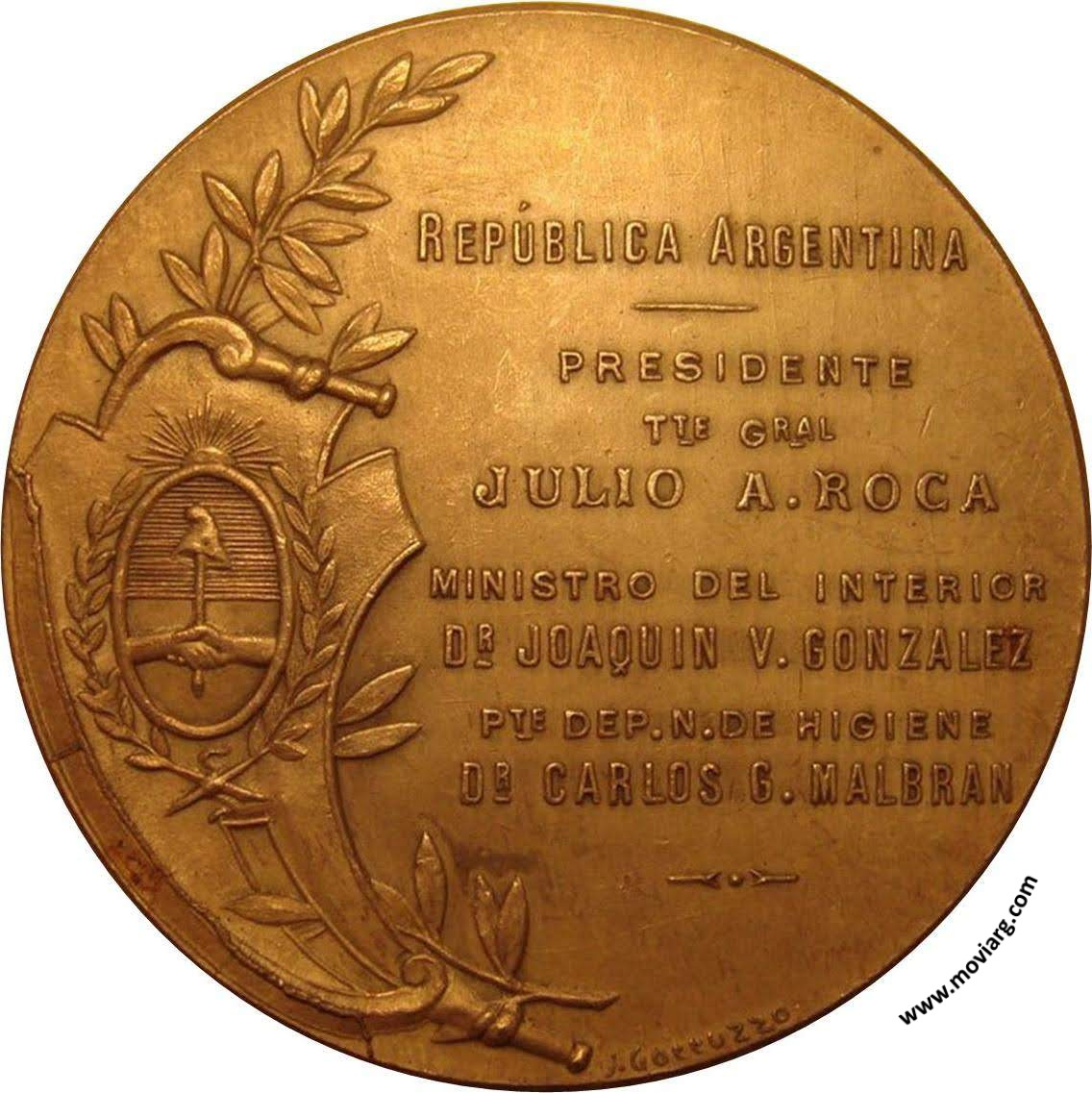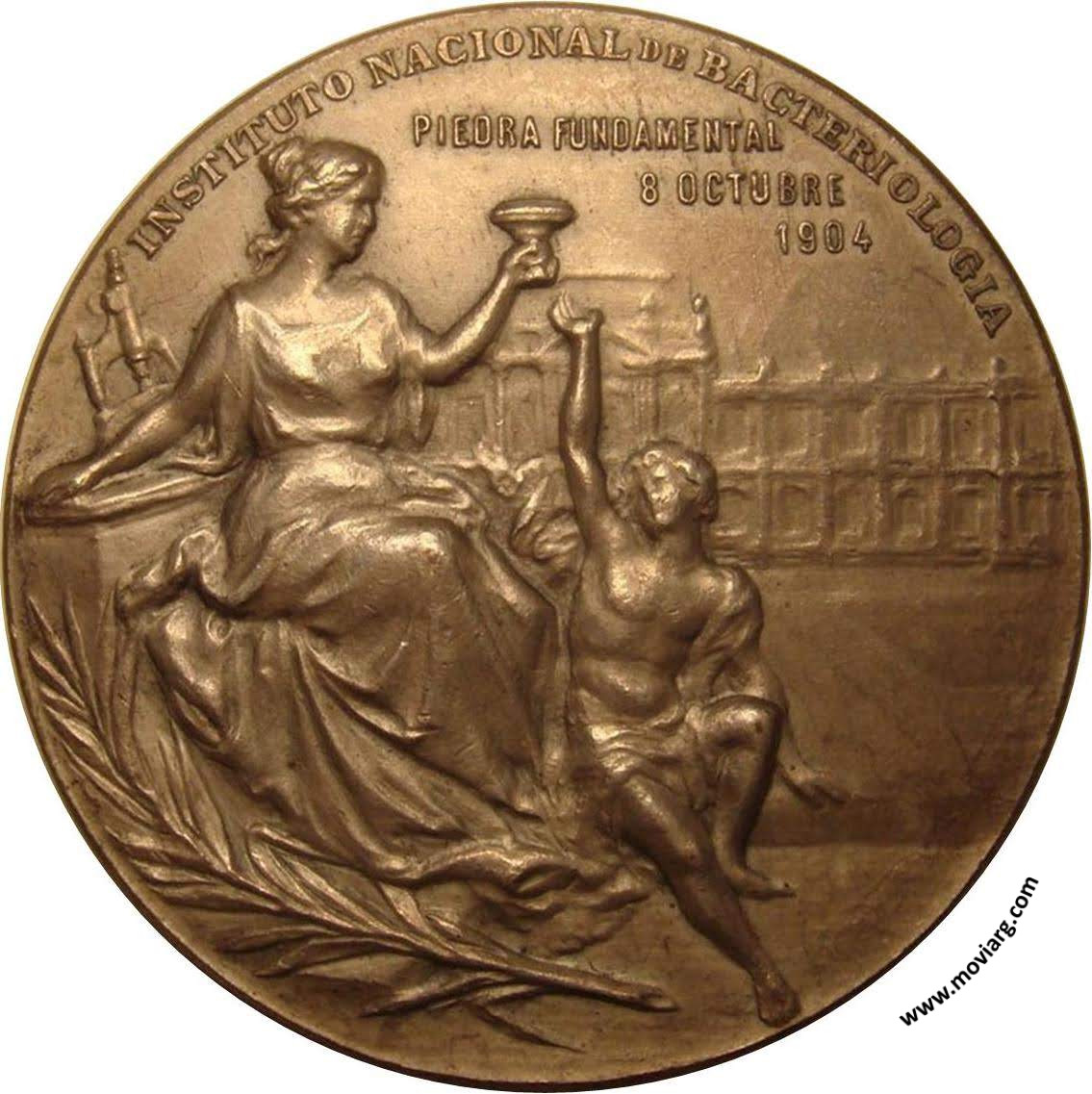 Anverso: INSTITUTO NACIONAL DE BACTERIOLOGIA / PIEDRA FUNDAMENTAL / 8 OCTUBRE / 1904 Reverso: REPÚBLICA ARGENTINA / PRESIDENTE / TTE. GRAL. / JULIO A. ROCA / MINISTRO DEL INTERIOR / DR. JOAQUIN V. GONZALEZ / PTE. DEP. N. DE HIGIENE / DR. CARLOS G. MALBRAN. Firma: J. GOTTUZZO Referencia: | |