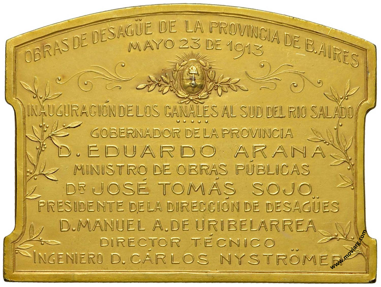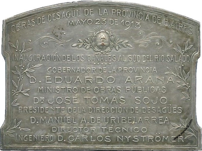 Anverso: Firma: GOTTUZZO Y CA. Reverso: OBRAS DE DESAGÜE DE LA PROVINCIA DE B. AIRES / MAYO 23 DE 1913 / INAUGURACIÓN DE LOS CANALES AL SUD DEL RIO SALADO / GOBERNADOR DE LA PROVINCIA / D. EDUARDO ARANA / MINISTRO DE OBRAS PÚBLICAS / DR. JOSÉ TOMÁS SOJO / PRESIDENTE DE LA DIRECCIÓN DE DESAGÜES / D. MANUEL A. DE URIBELARREA / DIRECTOR TÉCNICO / INGENIERO D. CÁRLOS NYSTRÖMER Referencia: | |