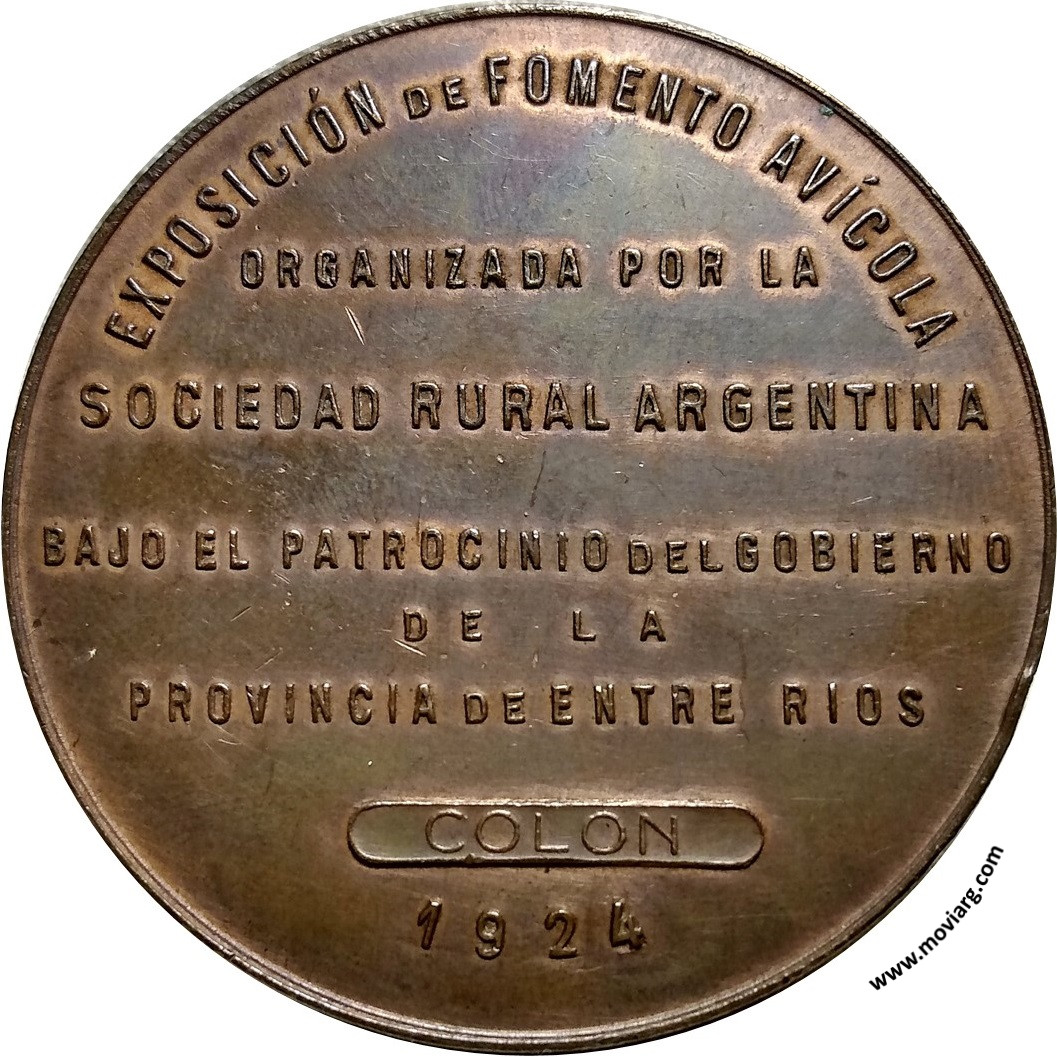 Colección @parryyanumismatico Anverso: Firma: F. COSTAReverso: EXPOSICIÓN DE FOMENTO AVÍCOLA / ORGANIZADA POR LA / SOCIEDAD RURAL ARGENTINA / BAJO EL PATROCINIO DEL GOBIERNO / DE LA / PROVINCIA DE ENTRE RIOS / COLON / 1924 Referencia: | |