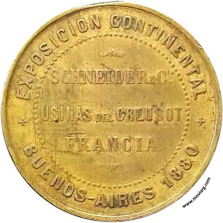 Anverso: EXPOSICION CONTINENTAL / SCHNEIDER & CIA. / USINAS DEL CREUSOT / FRANCIA / BUENOS-AIRES 1880 Reverso: L.D. FORGUES REPRESENTANTE / ALAMBRE DE ACERO / DEL / CREUSOT / ESPECIAL PARA CERCOS Canto: Humberto Burzio: "Buenos Aires en la medalla" 1981 p439. Referencia: BURZIO-1265 ROSA-1512 | |