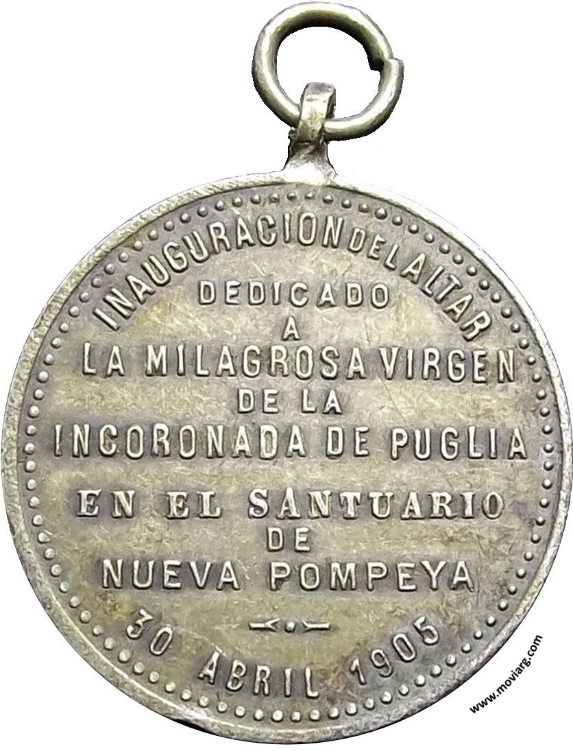Anverso: Reverso: INAUGURACION DEL ALTAR / DEDICADO / A / LA MILAGROSA VIRGEN / DE LA / INCORONADA DE PUGLIA / EN EL SANTUARIO / DE / NUEVA POMPEYA / 30 ABRIL 1905 Referencia: | |