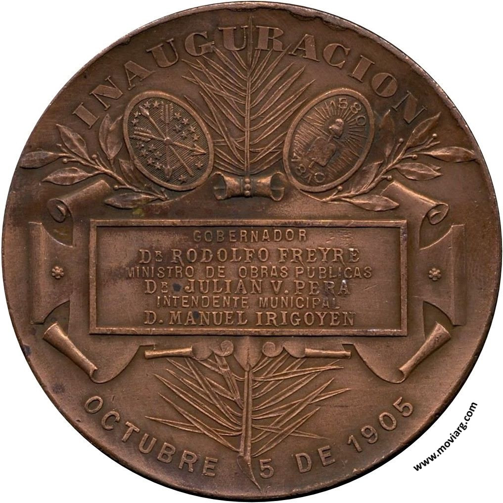 Anverso: TEATRO / DE SANTA FÉ / LEY N° 1152. Firma: BELLAGAMBA / Y ROSSI Reverso: INAUGURACION / OCTUBRE / 5 DE 1905 / GOBERNADOR / DR. RODOLFO FREYRE / MINISTRO DE OBRAS PUBLICAS / DR. JULIAN V. PERA / INTENDENTE MUNICIPAL / D. MANUEL IRIGOYEN Referencia: | |