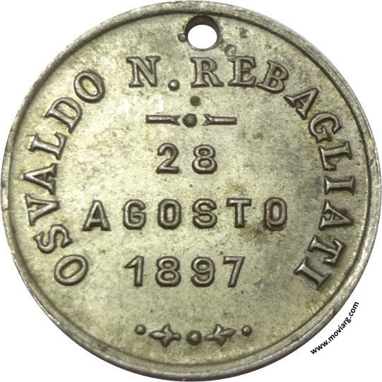 Anverso: RECUERDO DE BAUTISMO Reverso: OSVALDO N. REBAGLIATI / 28 / AGOSTO / 1897 Canto: Liso Referencia: | |