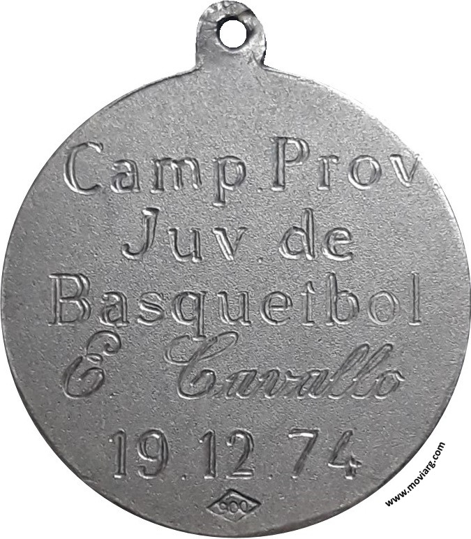 Colección HV Anverso: CIUDAD DE SAN FRANCISCOReverso: [ CAMP. PROV. ] / [ JUV. DE ] / [ BASQUETBOL ] / [ E. CAVALLO ] / [ 19.12.74 ]. Exergo: [ <900> ] Referencia: | |