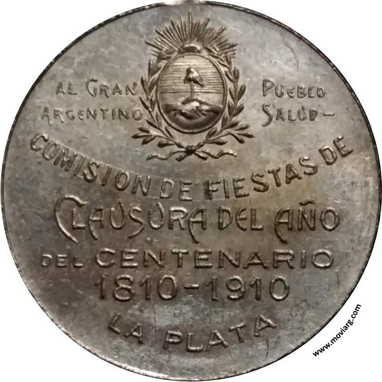 Anverso: Firma: A. BIDOGLIA Reverso: AL GRAN / PUEBLO / ARGENTINO / SALUD - / COMISION DE FIESTAS DE / CLAUSURA DEL AÑO / DEL CENTENARIO / 1810 - 1910 / LA PLATA Referencia: | |