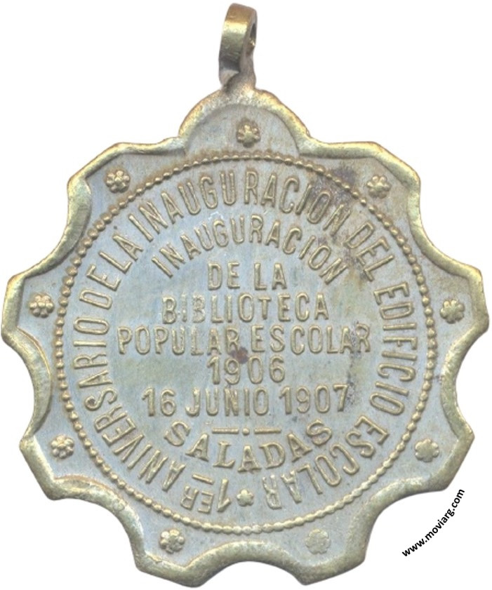 Anverso: Reverso: 1ER. ANIVERSARIO DE LA INAUGURACION DEL EDIFICIO ESCOLAR / INAUGURACION / DE LA / BIBLIOTECA / POPULAR ESCOLAR / 1906 / 16 JUNIO 1907 / SALADAS Referencia: | |