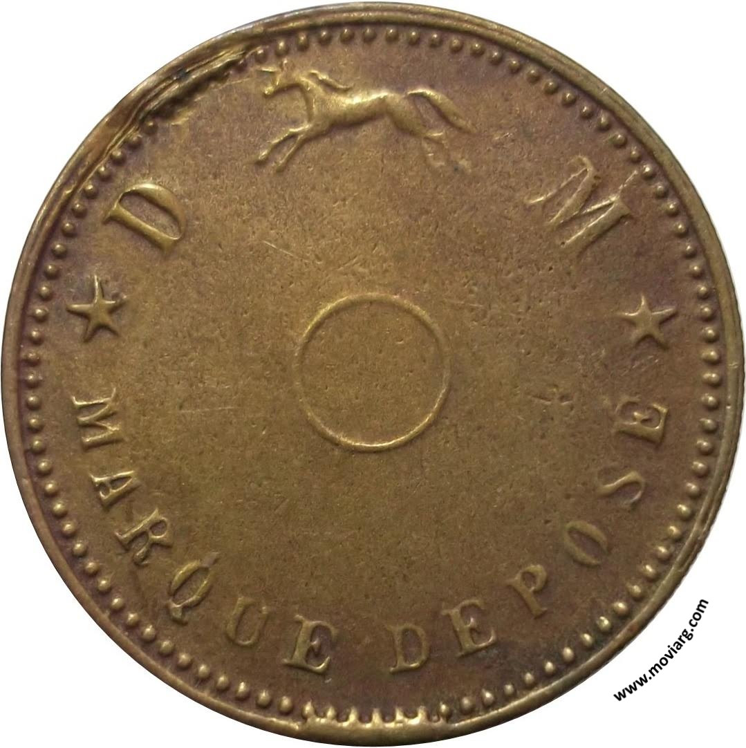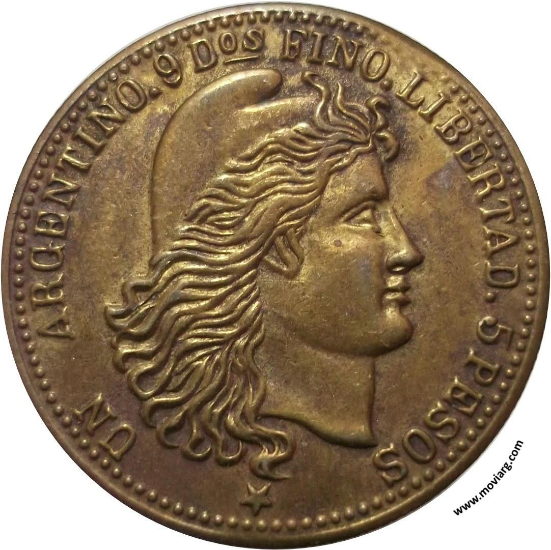 Anverso: UN ARGENTINO. 9 DOS. FINO. LIBERTAD. 5 PESOS Reverso: D M / MARQUE DEPOSÉ Canto: Estriado recto Referencia: | |