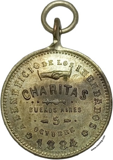 Anverso: 20 SETTEMBRE 1884. Campo: S.P.Q.R. Reverso: Á BENEFICIO DE LOS INUNDADOS / CHARITAS / BUENOS AIRES / 5 / OCTUBRE / 1884. Firma: PODESTA &. H. Referencia: | |