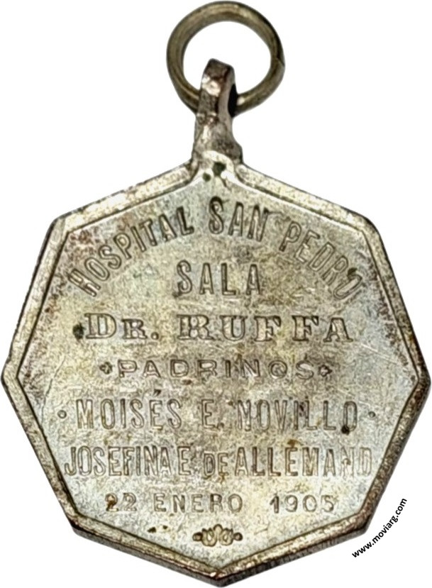 Anverso: Firma: BELLAGAMBA Y ROSSI Reverso: HOSPITAL SAN PEDRO / SALA / DR. RUFFA / PADRINOS / MOISÉS E. NOVILLO / JOSEFINA E. DE ALLEMAND / 22 ENERO 1905 Referencia: | |