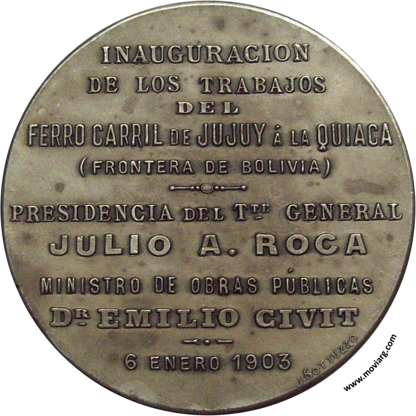 Anverso: PROGRESO / FRATERNIDAD Reverso: INAUGURACION / DE LOS TRABAJOS / DEL / FERRO CARRIL DE JUJUY Á LA QUIACA / (FRONTERA DE BOLIVIA) / PRESIDENCIA DEL TTE. GENERAL / JULIO A. ROCA / MINISTRO DE OBRAS PÚBLICAS / DR. EMILIO CIVIT / 6 ENERO 1903. Firma: J. GOTTUZZO Referencia: | |