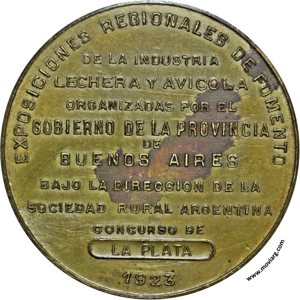 Colección @parryyanumismatico Anverso: Firma: F. COSTAReverso: EXPOSICIONES REGIONALES DE FOMENTO / DE LA INDUSTRIA / LECHERA Y AVICOLA / ORGANIZADAS POR EL / GOBIERNO DE LA PROVINCIA / DE / BUENOS AIRES / BAJO LA DIRECCION DE LA / SOCIEDAD RURAL ARGENTINA / CONCURSO DE / LA PLATA / 1923 Referencia: | |
