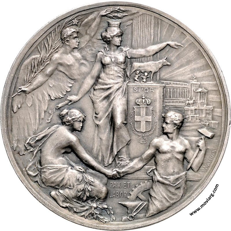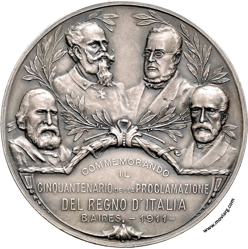 Anverso: COMMEMORANDO / IL / CINQUANTENARIO DELLA PROCLAMAZIONE / DEL REGNO D'ITALIA / B. AIRES - 1911 - Reverso: PAX ET / LABOR. Campo: SPQR. Firma: A. BIDOGLIA Referencia: BURZIO-4995 | |