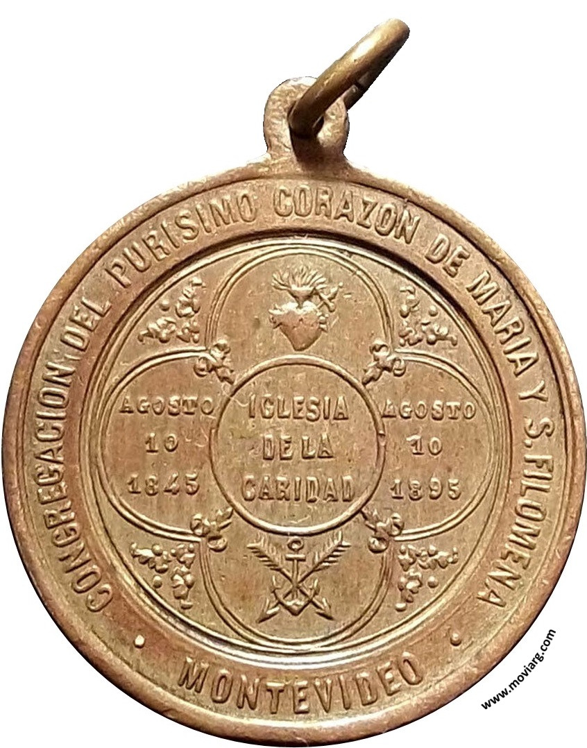 Anverso: FUNDADOR EL R. P. FRANCISCO RAMON CABRÉ DE LA COMPAÑIA DE JESUS. Firma: ORZALI B. Y C. Reverso: CONGREGACION DEL PURISIMO CORAZON DE MARIA Y S. FILOMENA / MONTEVIDEO / AGOSTO / 10 / 1845 / IGLESIA / DE LA / CARIDAD / AGOSTO / 10 / 1895 Referencia: | |