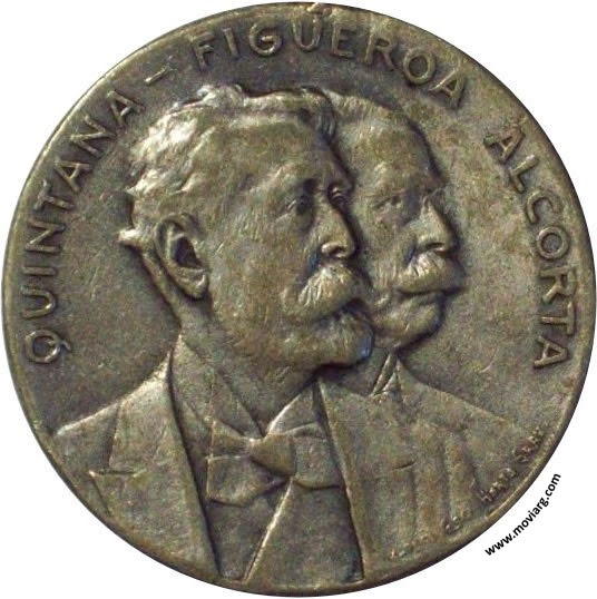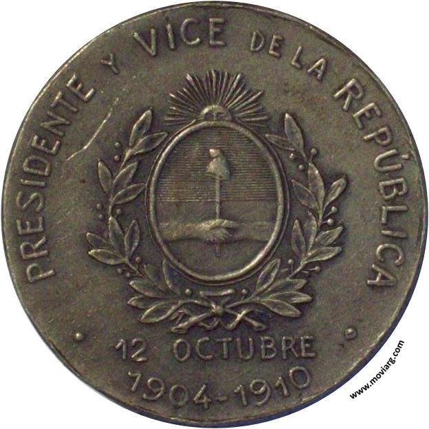 Anverso: QUINTANA - FIGUEROA ALCORTA. Firma: DE-PARI ESC. HORTA GRAB. Reverso: PRESIDENTE Y VICE DE LA REPUBLICA / 12 OCTUBRE / 1904 - 1910 Canto: Humberto Burzio: "Buenos Aires en la medalla" 1981 p42. Referencia: BURZIO-108 | |