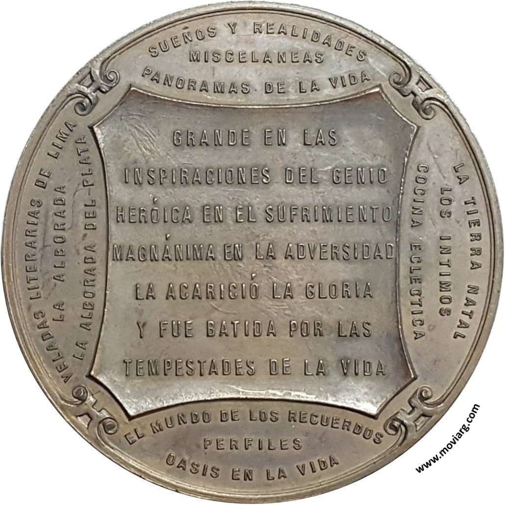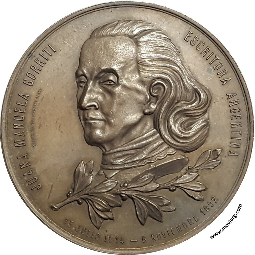 Anverso: JUANA MANUELA GORRITI / ESCRITORA ARGENTINA / 15 JULIO 1814 - 6 NOVIEMBRE 1892. Firma: TALLER NACIONAL - BUENOS AIRES Reverso: GRANDE EN LAS / INSPIRACIONES DEL GENIO / HERÓICA EN EL SUFRIMIENTO / MAGNÁNIMA EN LA ADVERSIDAD / LA ACARICIÓ LA GLORIA / Y FUE BATIDA POR LAS / TEMPESTADES DE LA VIDA. Exergo: SUEÑOS Y REALIDADES / MISCELANEAS / PANORAMAS DE LA VIDA / LA TIERRA NATAL / LOS INTIMOS / COCINA ECLECTICA / EL MUNDO DE LOS RECUERDOS / PERFILES / OASIS EN LA VIDA / VELADAS LITERARIAS DE LIMA / LA ALBOROTADA / LA ALBORODA DEL PLATA Referencia: | |