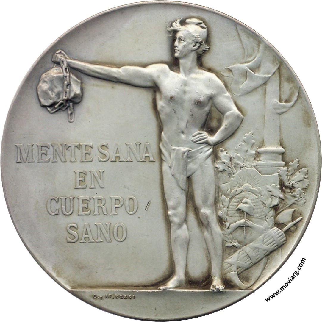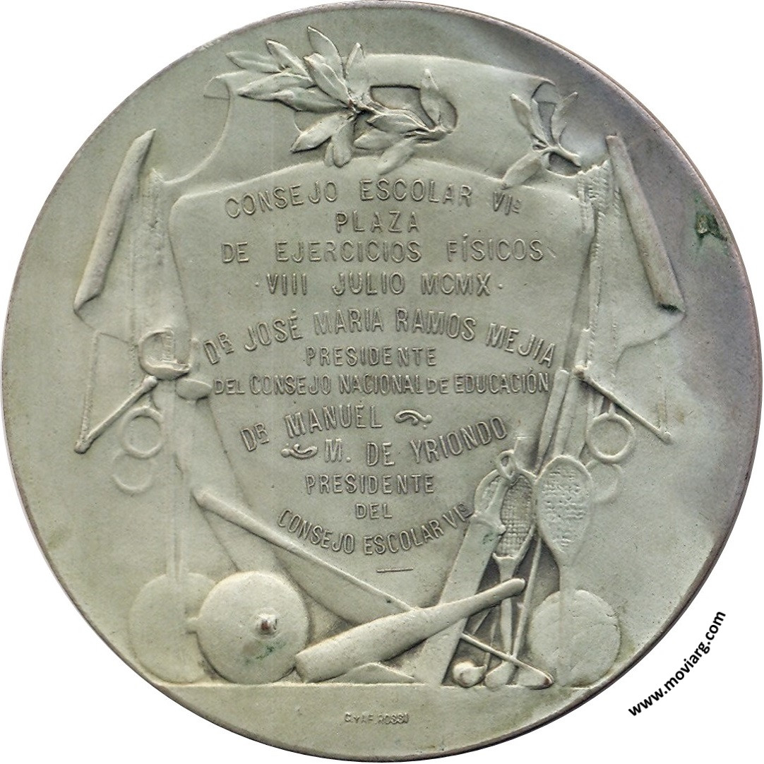 Anverso: MENTE SANA / EN / CUERPO / SANO. Firma: C. Y AF. ROSSI Reverso: CONSEJO ESCOLAR VIº / PLAZA / DE EJERCICIOS FÍSICOS / VIII JULIO MCMX / DR. JOSÉ MARIA RAMOS MEJIA / PRESIDENTE / DEL CONSEJO NACIONAL DE EDUCACIÓN / DR. MANUEL / M. DE YRIONDO / PRESIDENTE / DEL / CONSEJO ESCOLAR VIº. Firma: C. Y AF. ROSSI Referencia: | |