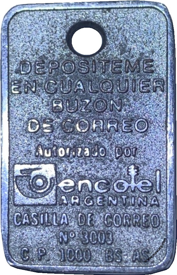 Colección Magnin Anverso: AEROLINEAS / ARGENTINAS / PROTECCION / DE LLAVES / [ 006929 ]Reverso: DEPOSITEME / EN CUALQUIER / BUZON / DE CORREO / AUTORIZADO POR / ENCOTEL / ARGENTINA / CASILLA DE CORREO / N° 3003 / C. P. 1000 BS. AS. Referencia: | |