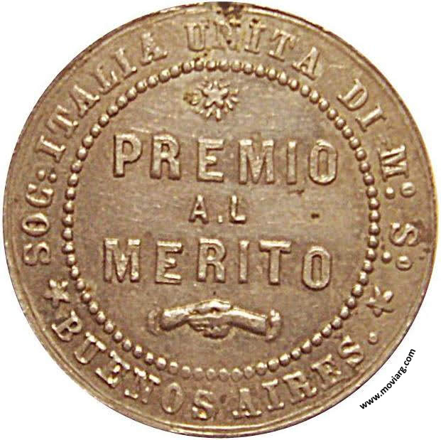 Anverso: Firma: S. GRANDE Reverso: SOC:ITALIA UNITA DI MO. SO. / BUENOS AIRES. / PREMIO / AL / MERITO Referencia: | |