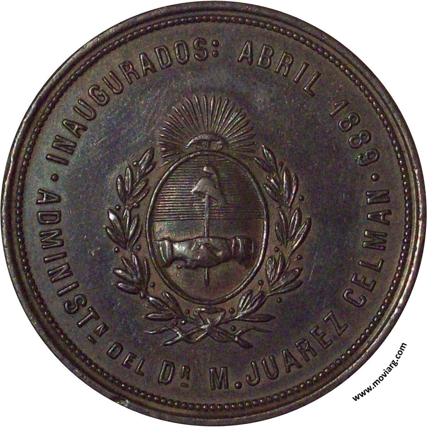 Anverso: BAÑOS PÚBLICOS DE LA CAPITAL / FUNDADOR : CARLOS GAUDENCIO Reverso: INAUGURADOS : ABRIL 1889 / ADMINISTN. DEL DR. M. JUAREZ CELMAN Referencia: BURZIO-243 ROSA-344/119 | |